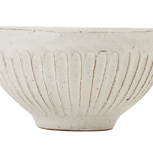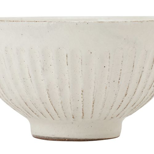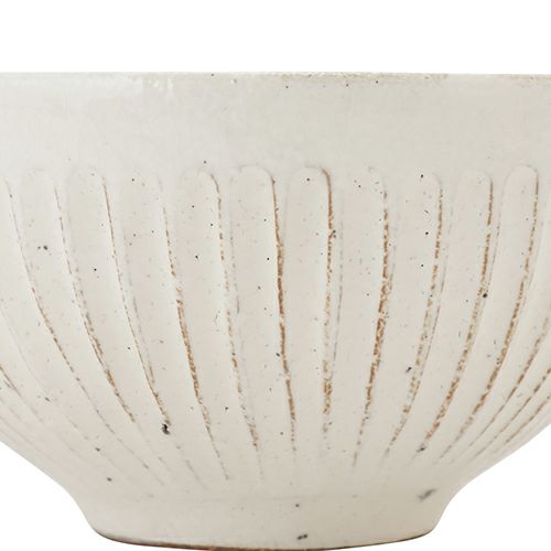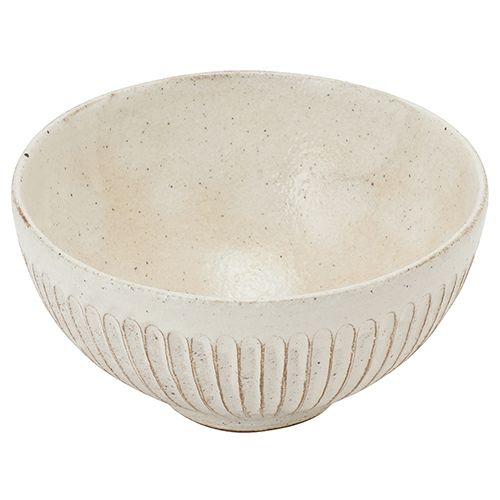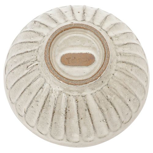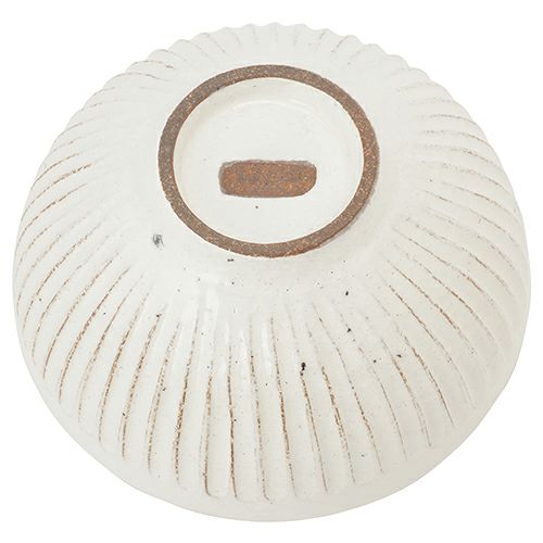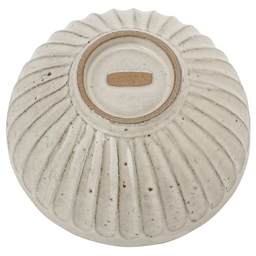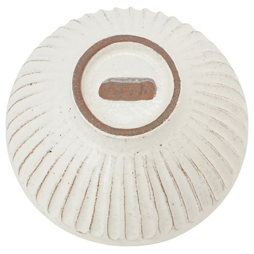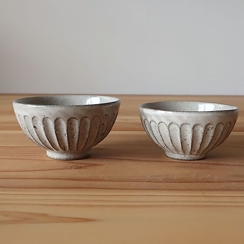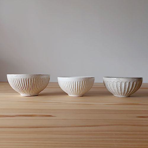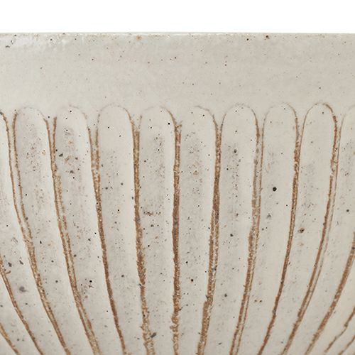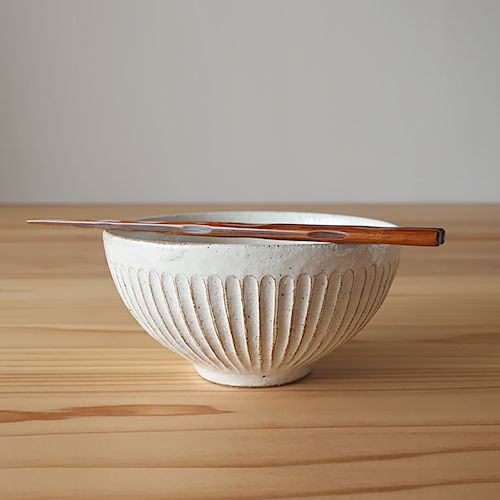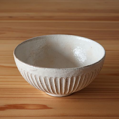 丁寧に彫られている縞模様は、鎬(しのぎ)とい技法です。成型をした後に道具を使って土の表面を削り取ることで筋ができます。それが模様となり温もりのある質感に。藤山窯のうつわは、細い鎬・太い鎬と二種類あります。