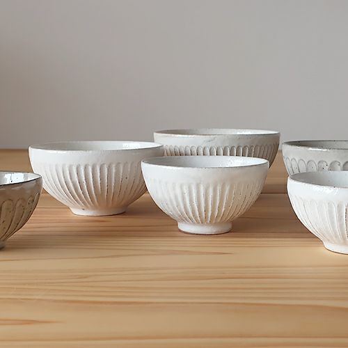 細い鎬はシャープな印象に。洋食とも相性抜群です。太い鎬はより温かみのある雰囲気に。全て手で彫っているので、土の少し立っているところが手作りならではの感触となります。量産だとこの感触は生まれません。加藤さんはこれまで何十万回も彫ってきました。釉薬が溝に流れ込 む事でほんのり見える素朴な土の色が鎬の技術を際立たせています。
