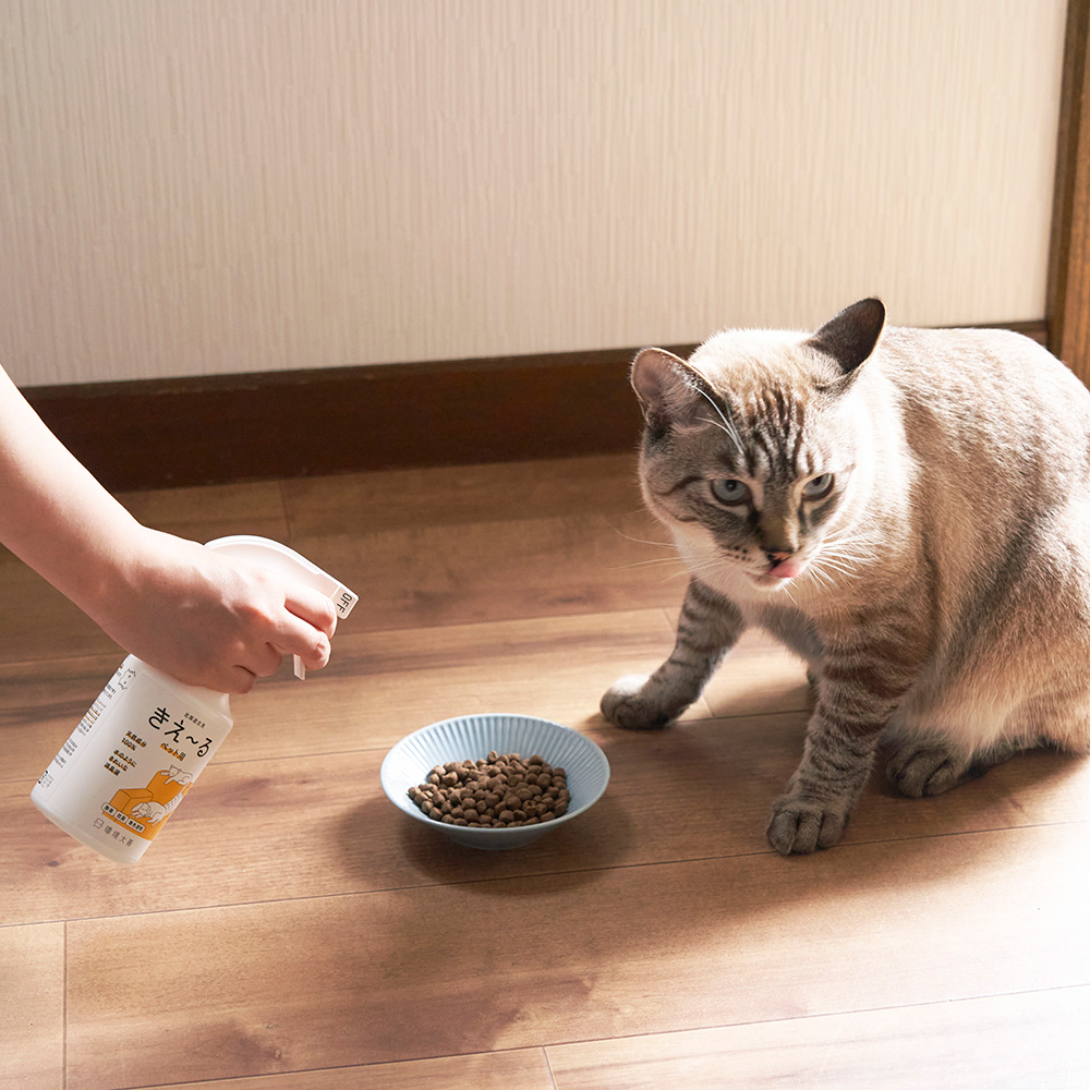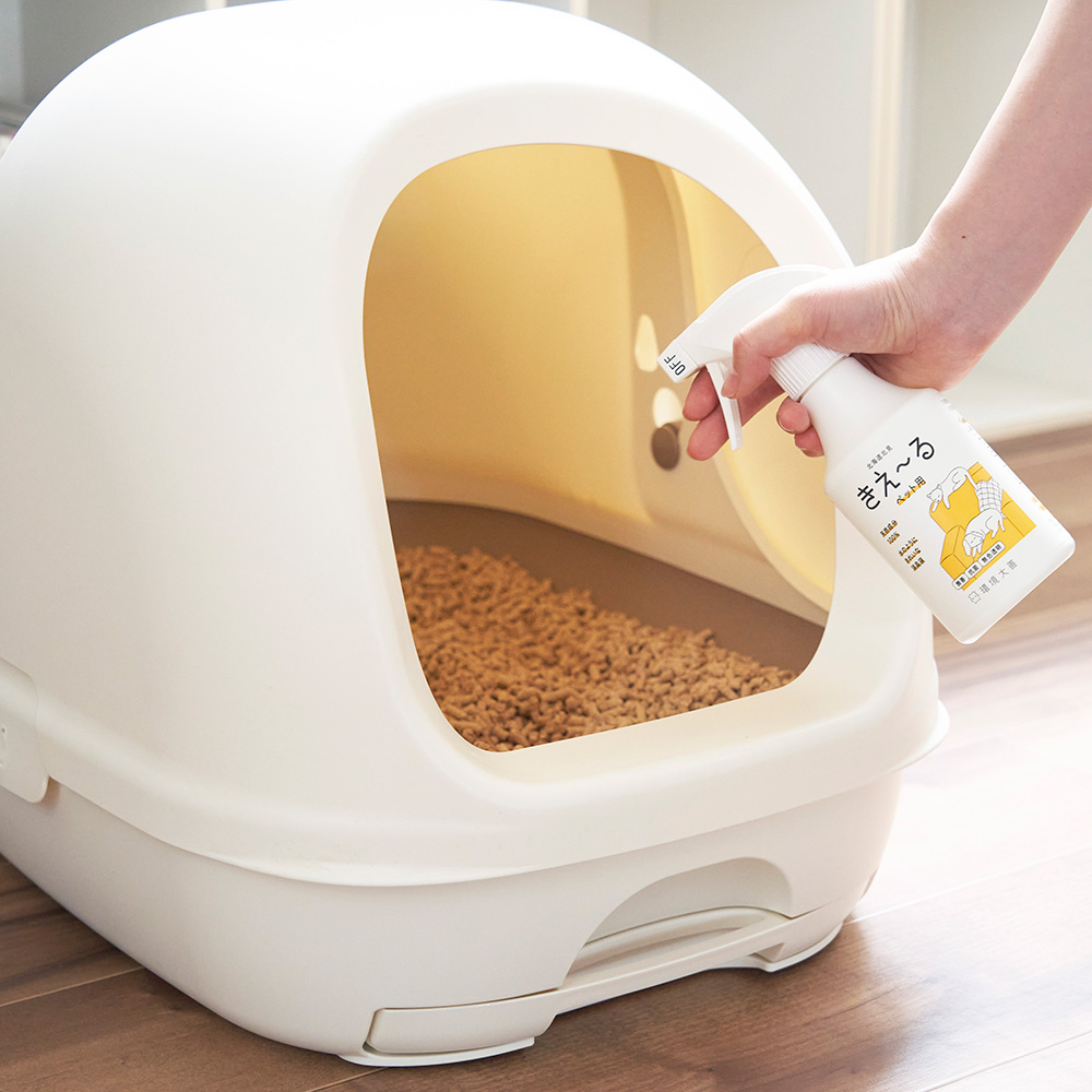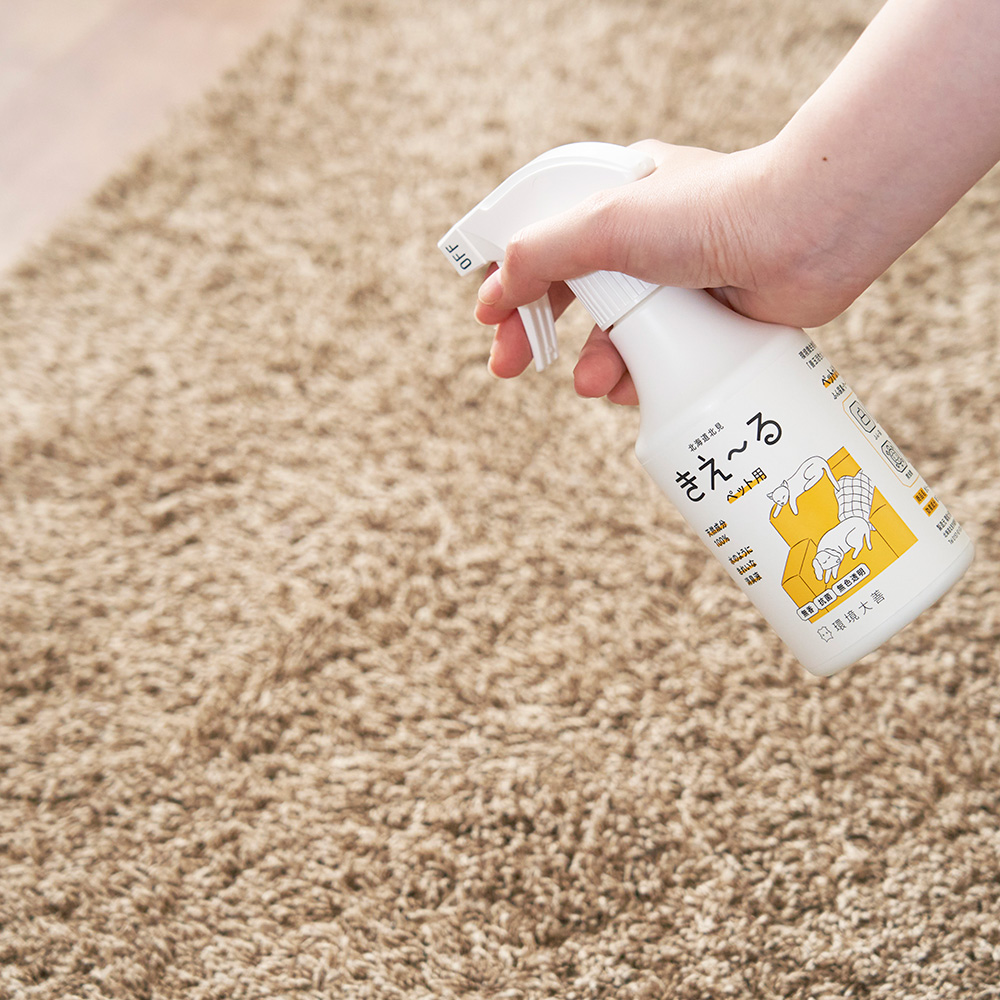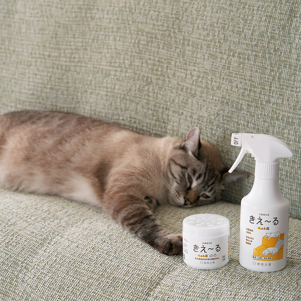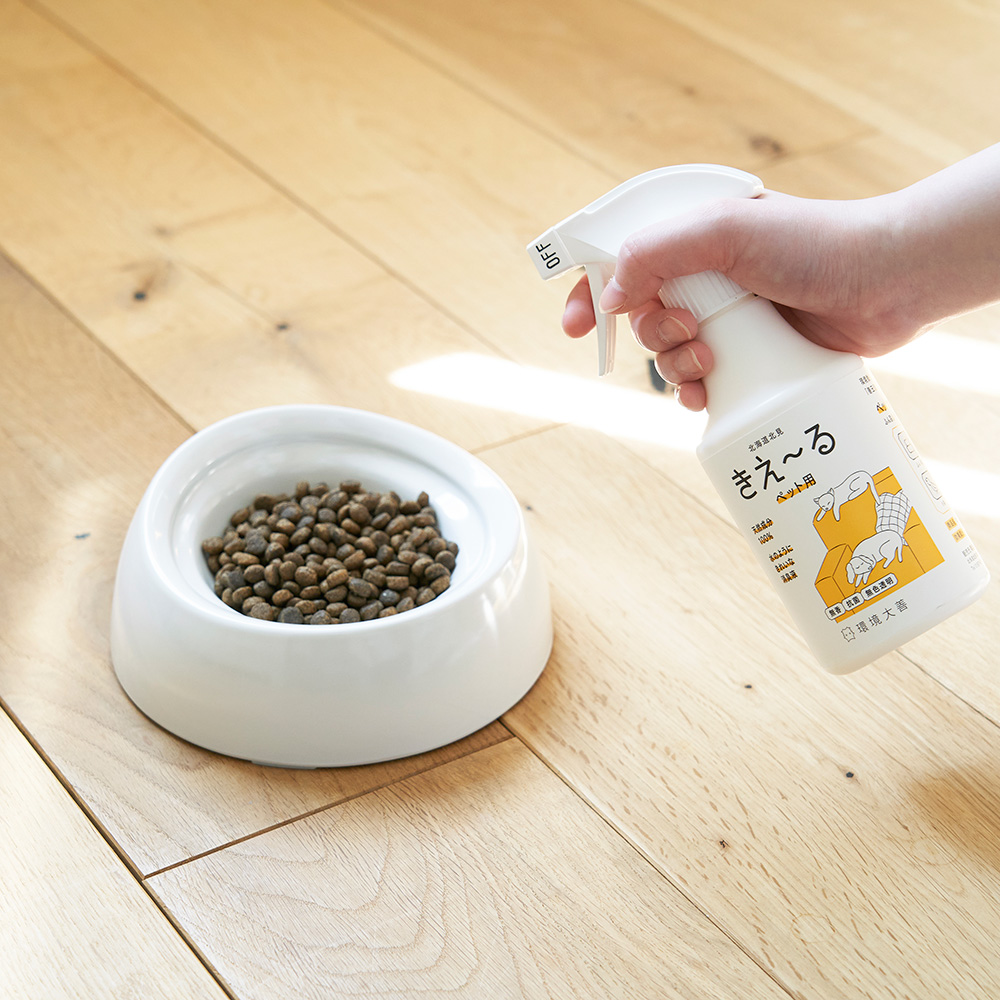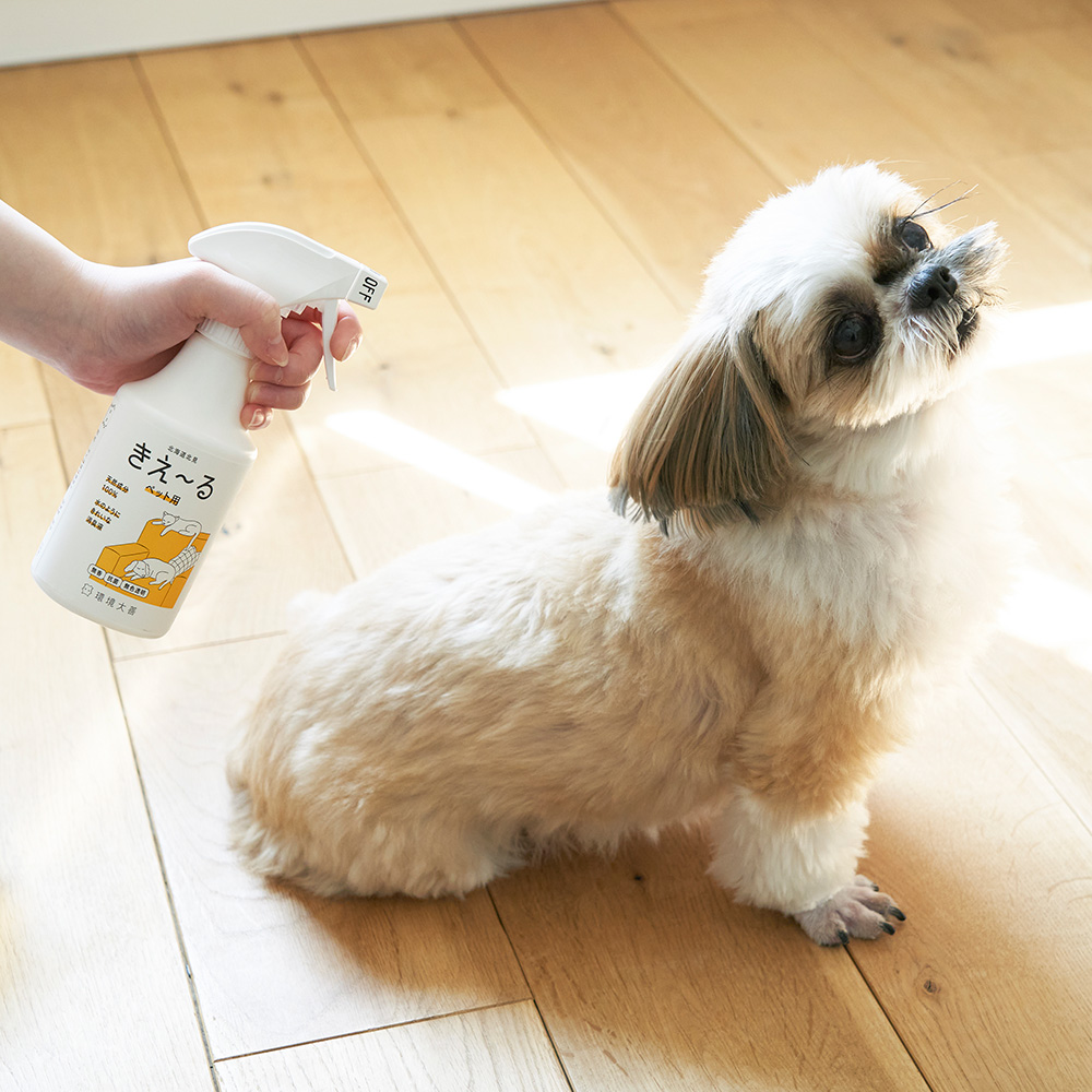 ペットと一緒に暮らす中で、トイレやケージのニオイは気になるもの。でも、化学物質の入った消臭スプレーを使うのは不安ですよね。「きえ~る」は天然成分100%でできているため、ペットが舐めてしまっても全く問題ありません。液体のスプレータイプは、飲み水やご飯にシュッと吹きかけて、体の中から便や尿のニオイを軽減することもできるという驚きの安全性です。