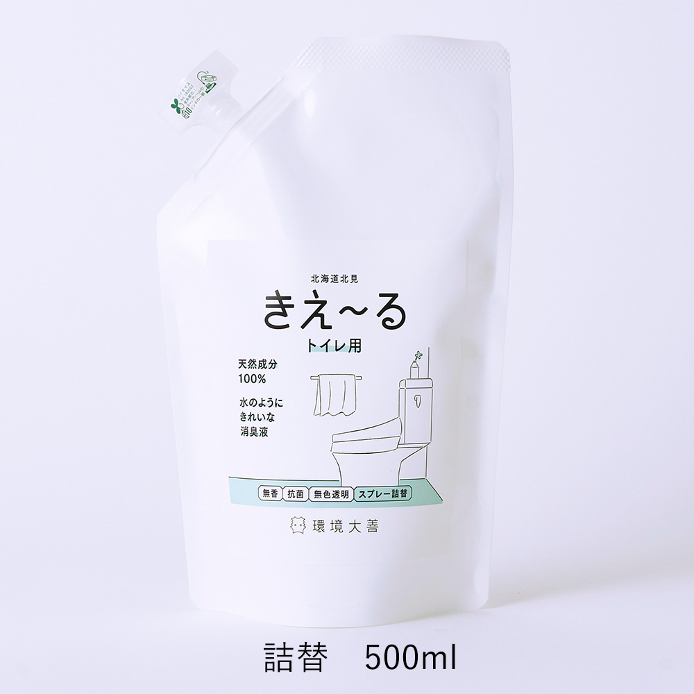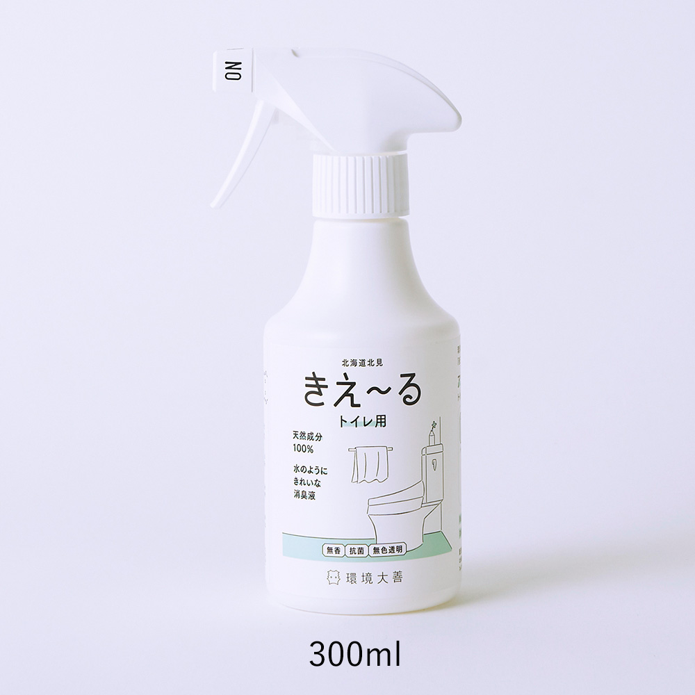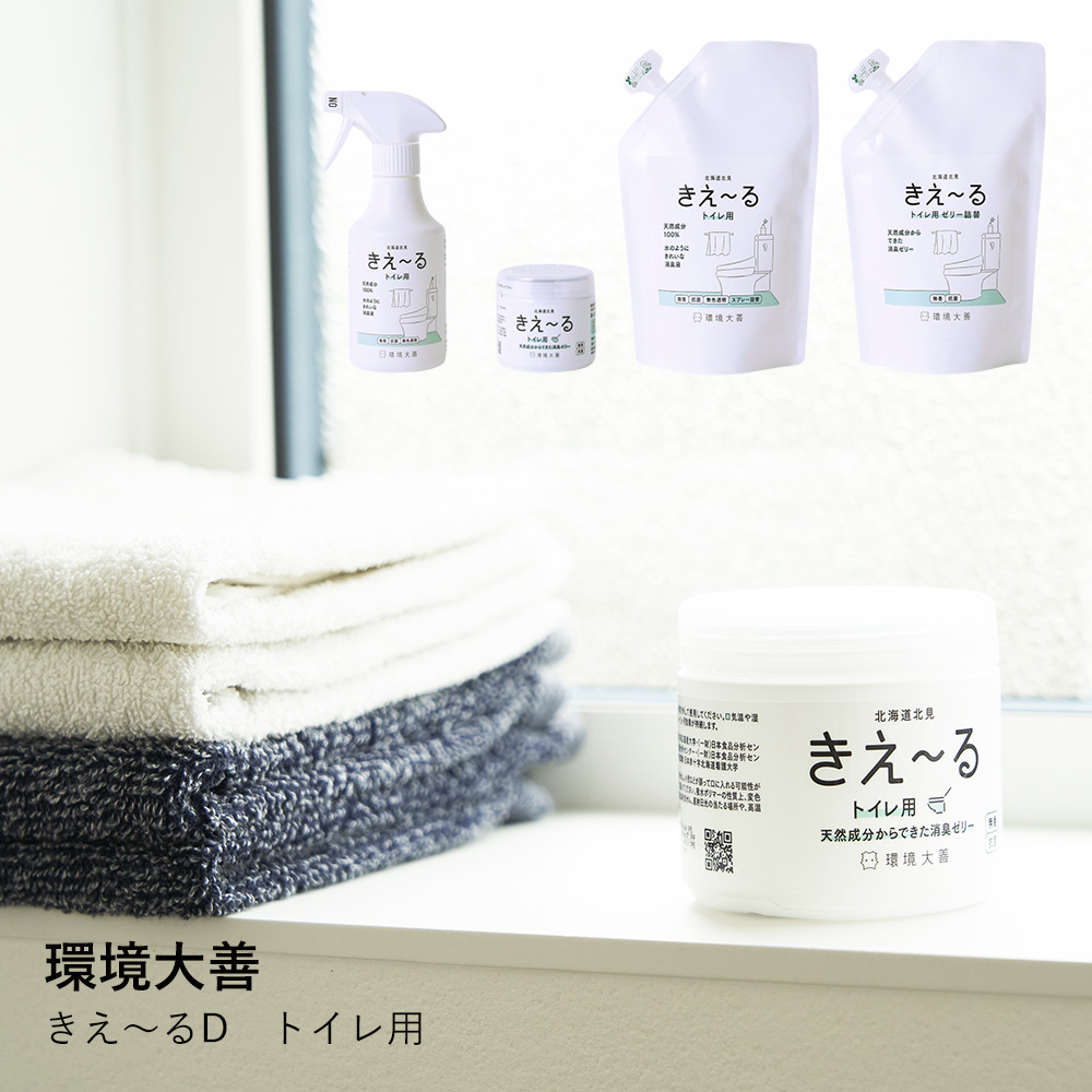 北海道北見市の「環境大善」が独自に開発した、環境にも人にもやさしいバイオ消臭液「きえ~る」。未利用バイオマス(牛の尿)を、乳酸菌などの環境微生物群で発酵・培養した「善玉活性水」から生まれた、100%天然成分の消臭アイテムです。
