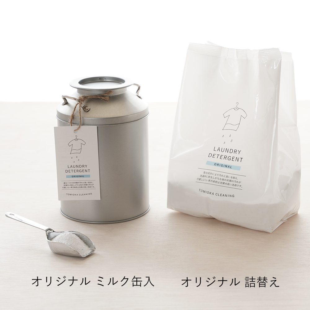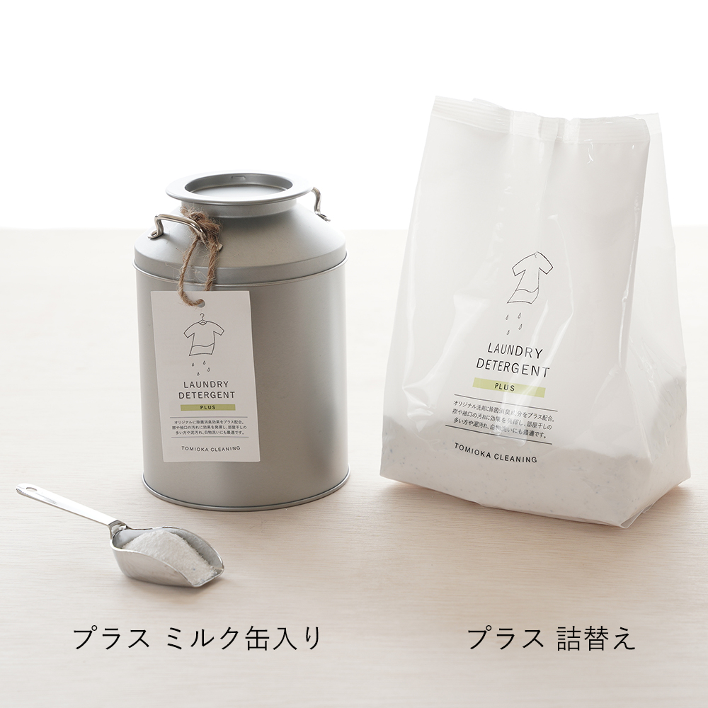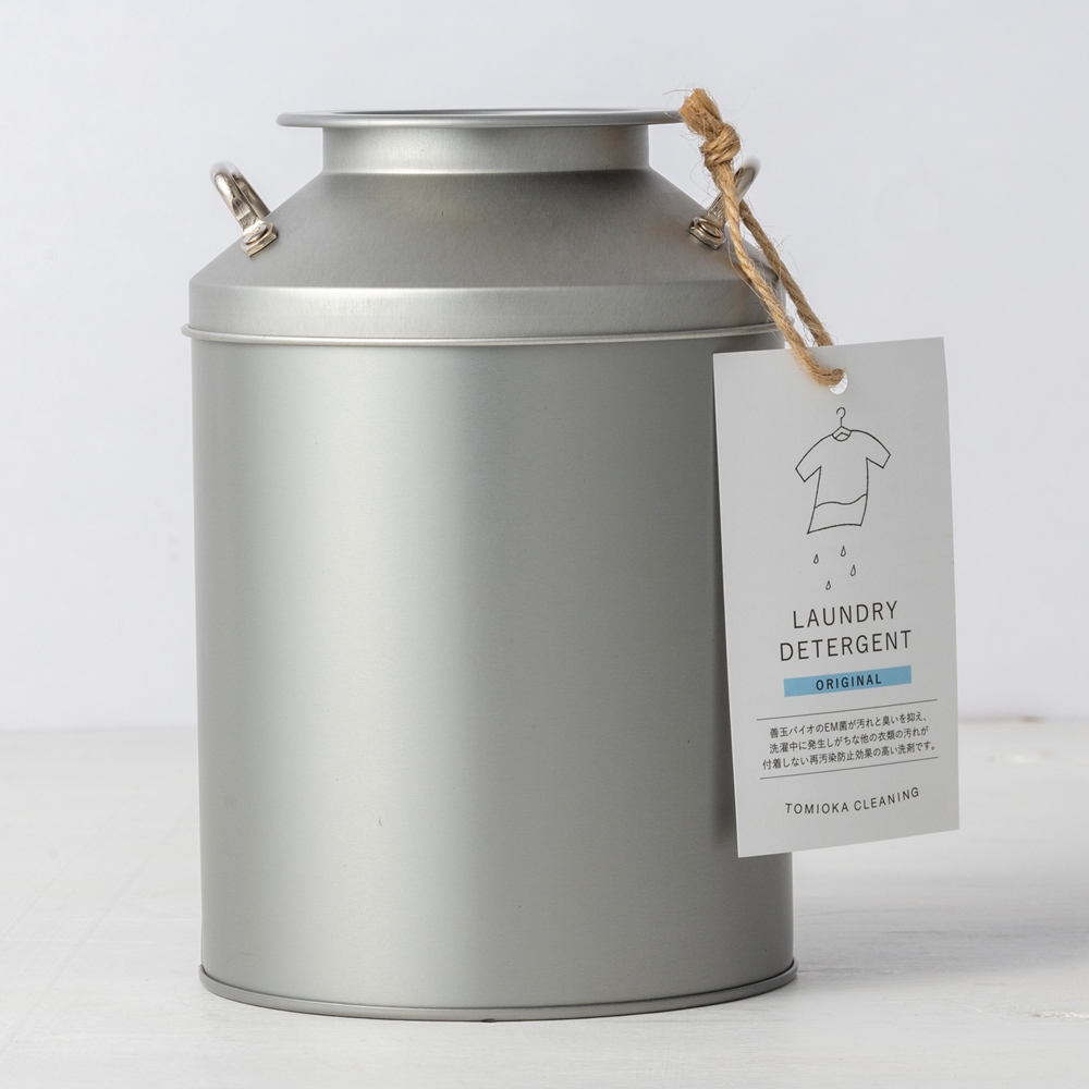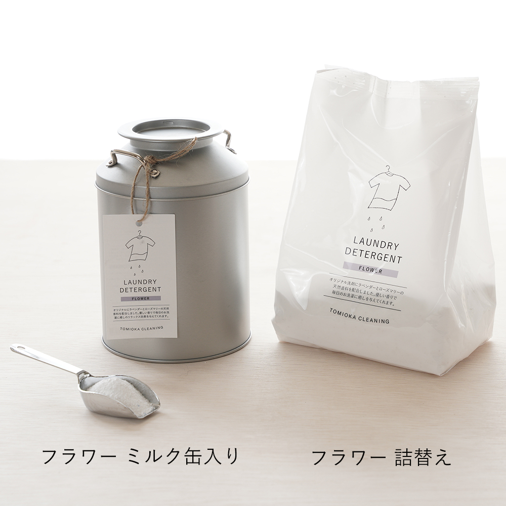 【とみおかクリーニング】粉末洗濯洗剤オリジナル・プラス・フラワー 詰替え ・ミルク缶入り/ステンレス計量スコップ付