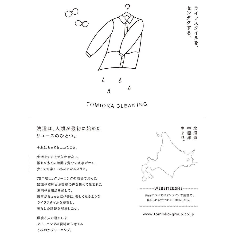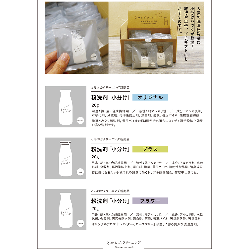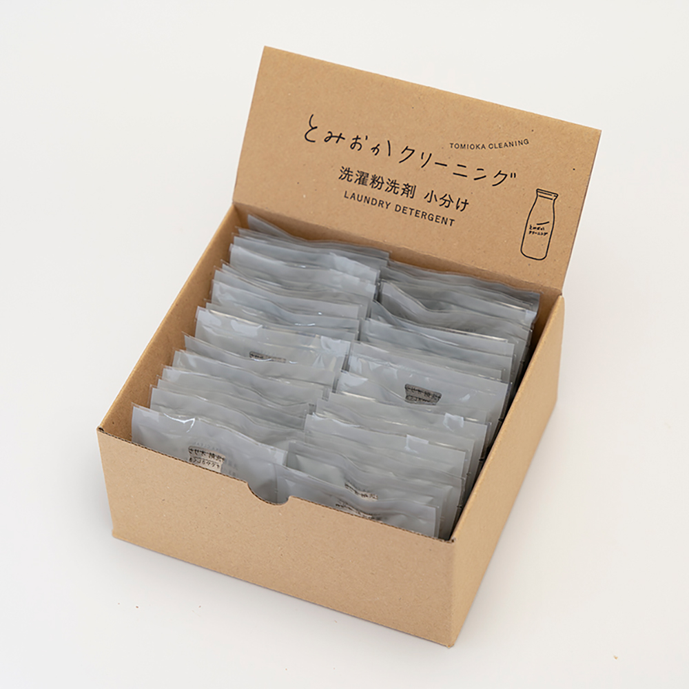 北海道の老舗クリーニング店「とみおかクリーニング」から生まれた、人にも環境にも優しい粉末洗剤。その驚きの仕上がりを気軽にお試しいただける、便利な「小分パック」です。