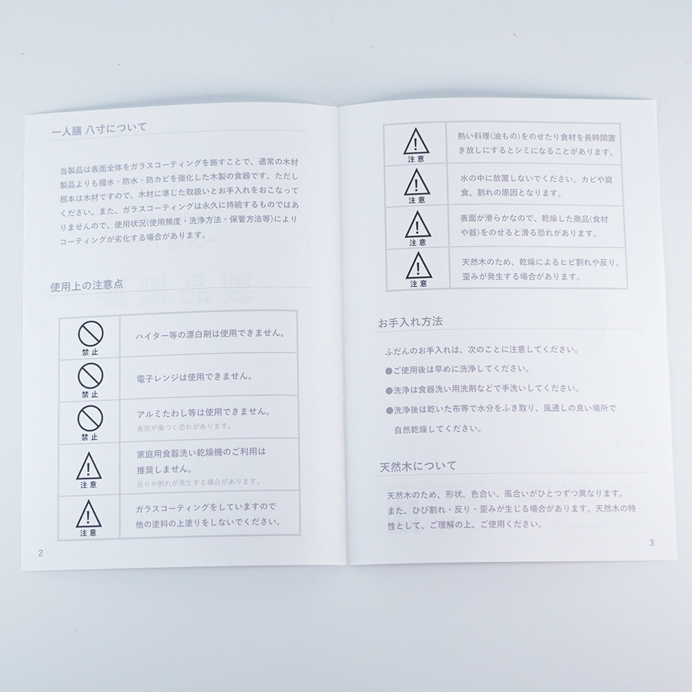 この一人膳をより良い状態で長くお使いいただくために、以下の点にご注意ください。