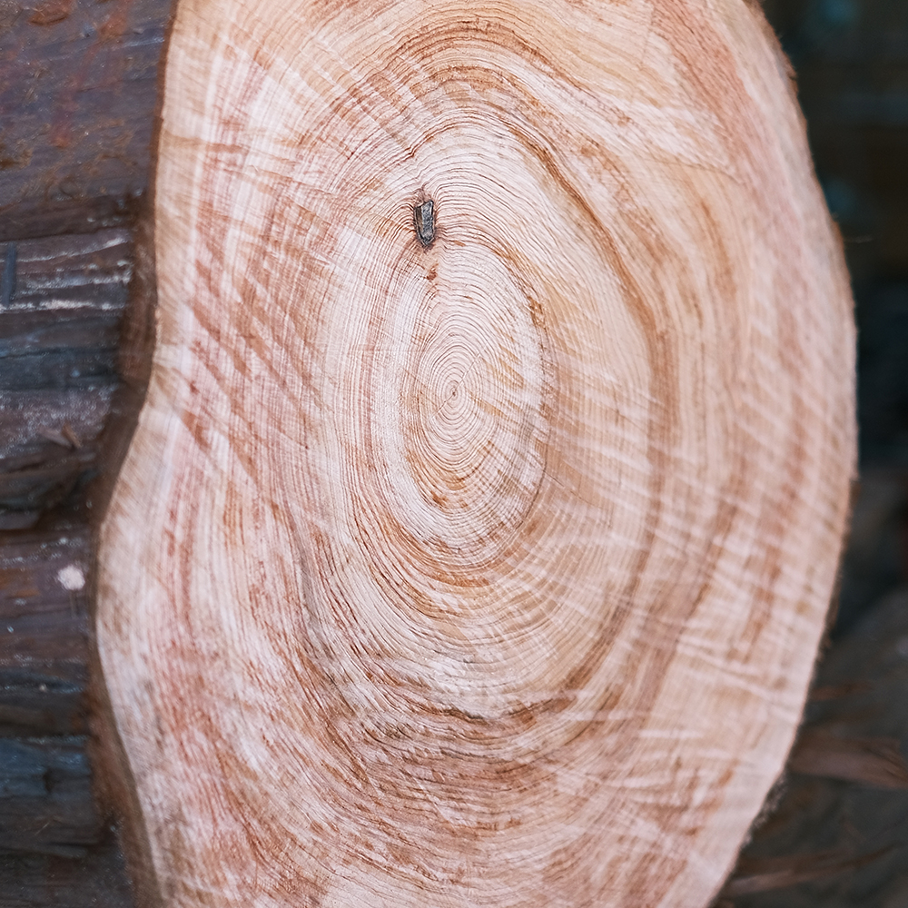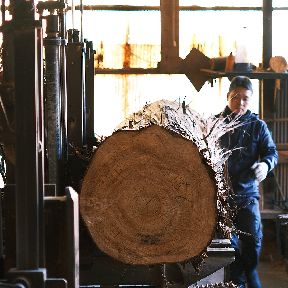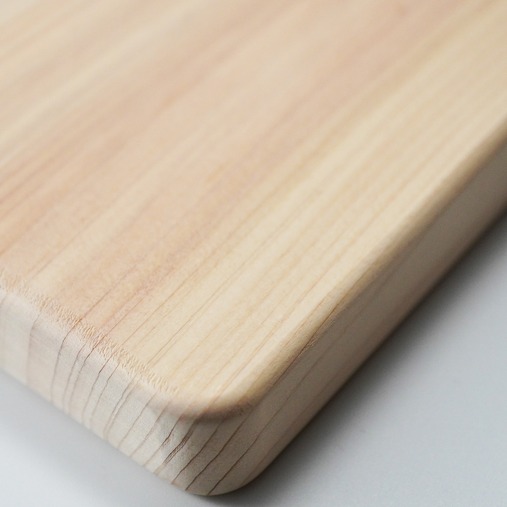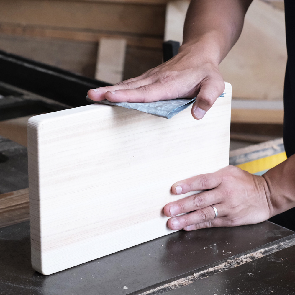 日本に数人しかいない木挽き(こびき)職人の監修のもと、国産檜のなかでも反りや割れが少なく、包丁の刃に優しい「柾目(まさめ)材」の一枚板のみを厳選。さらに約半年の天然乾燥と人工乾燥を組み合わせ、徹底した品質管理を経て一つひとつ丁寧に仕上げられています。