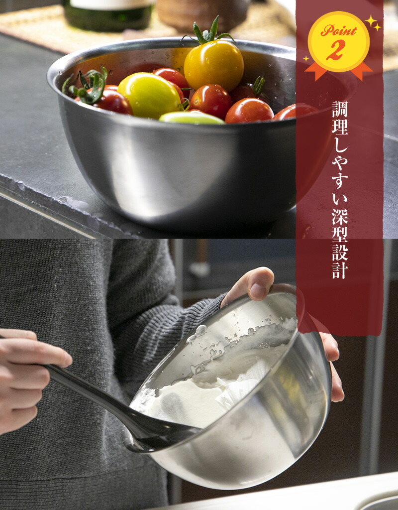 一般的なボールより深型になっており、混ぜやすく、たっぷりものが入ります。
