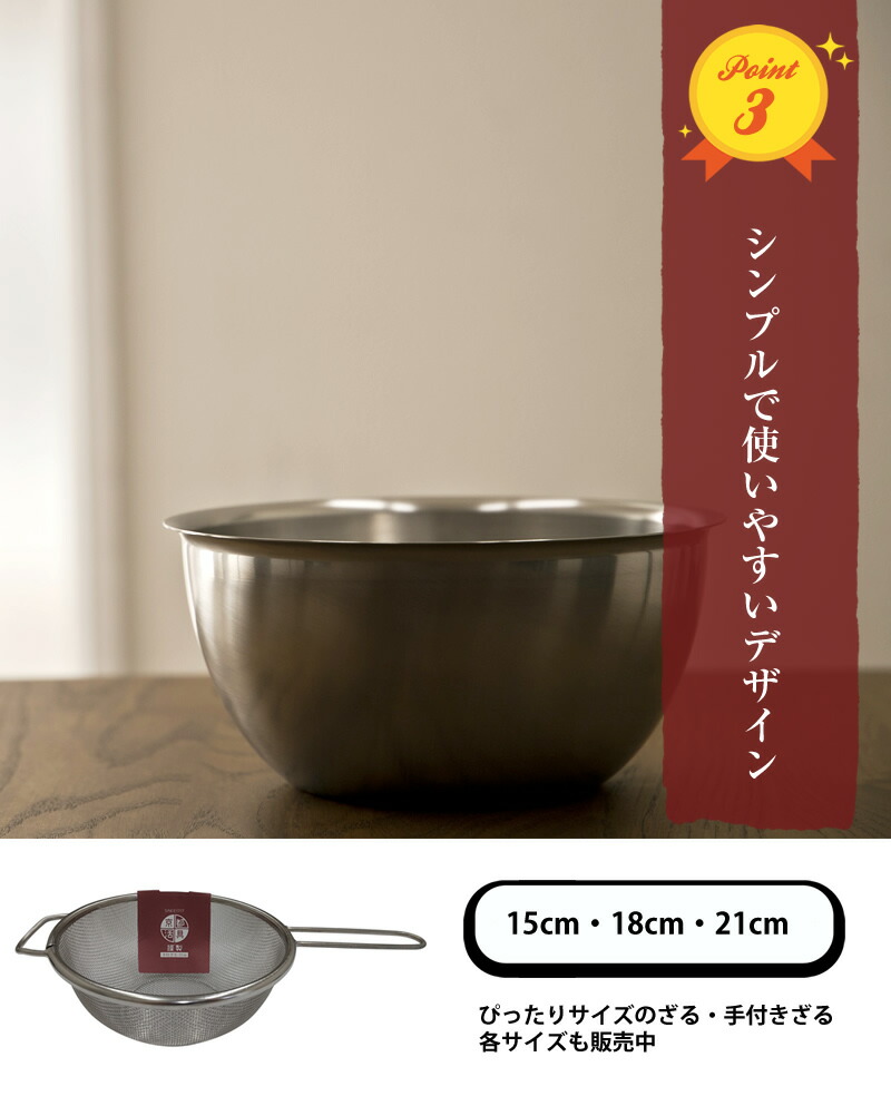 ボウル | 京都活具 | ステンレス 15cm 18cm 21cm ざる セット 料理 調理器具 キッチン用品 日本製 おしゃれ ギフト プレゼント キッチン用品便利グッズ キッチン用品・調理器具取扱説明書