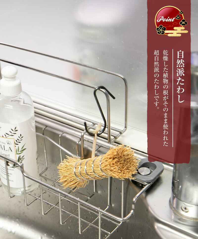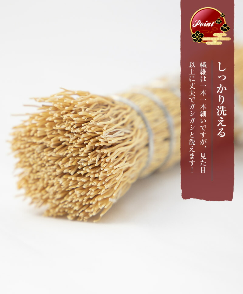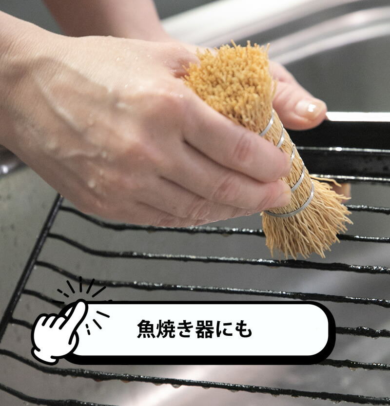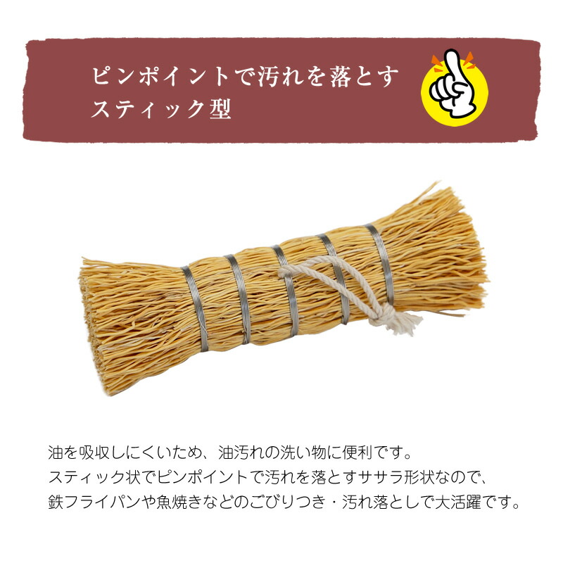 刈萱の根を乾燥させ、繊維の強さをそのままに製品化しています。このタワシは、油を吸収しにくいため、特に油汚れの洗い物に便利で、魚焼き器や鉄フライパンの頑固な汚れをしっかり落とせます。スティック状でピンポイントに汚れを落とせるササラ形状は、細かい部分まで行き届くため、さまざまな場面で活躍します。