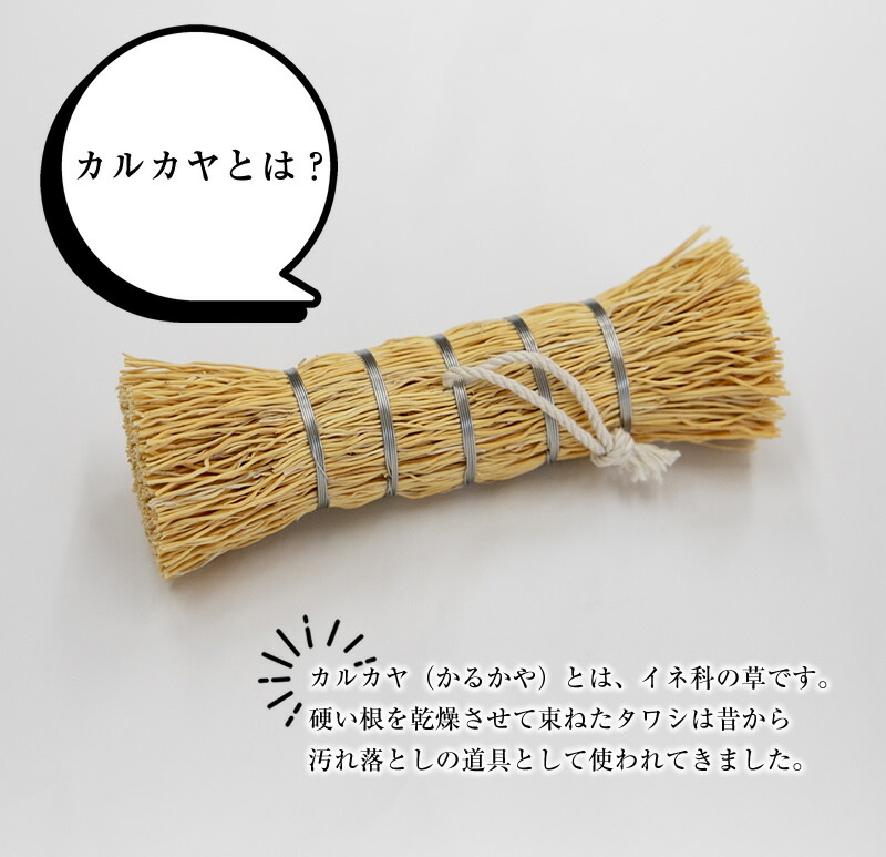 カルカヤタワシは、イネ科の草である刈萱(カルカヤ)の根を活用した、環境に優しい掃除道具です。職人によって一つ一つ丁寧に手作りされ、昔ながらの知恵による自然派タワシとして多くの家庭で愛されています。