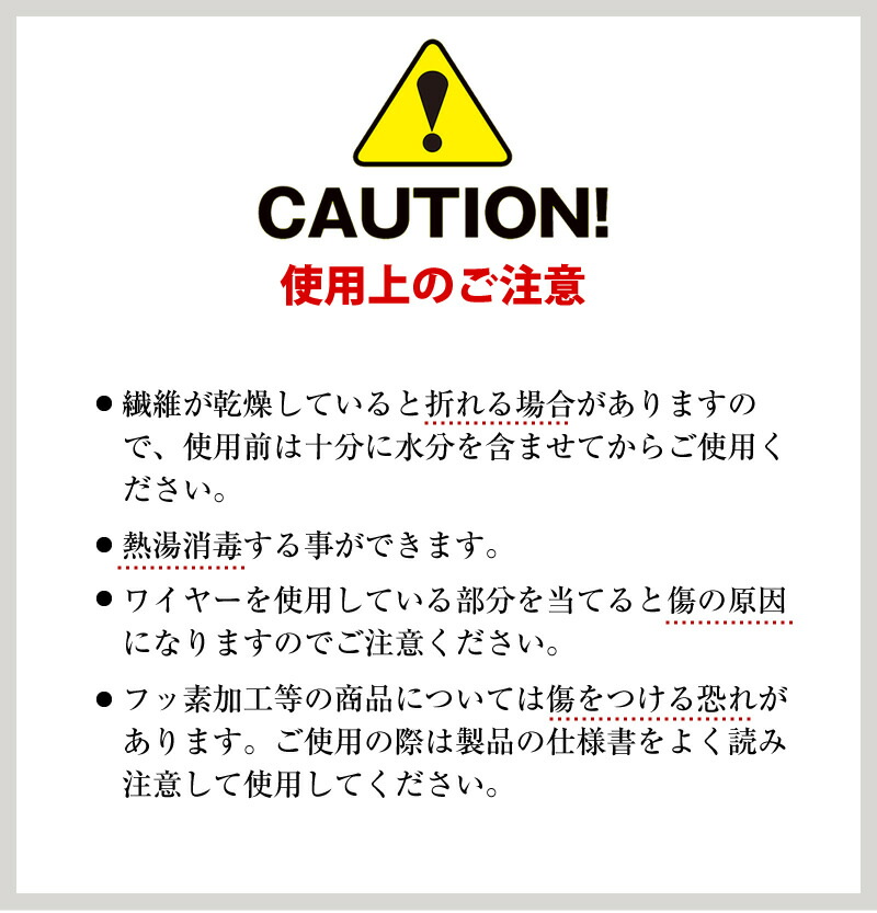 • 繊維が乾燥していると折れる場合がありますので、使用前は十分に水分を含ませてからご使用ください。 熱湯消毒することができます。