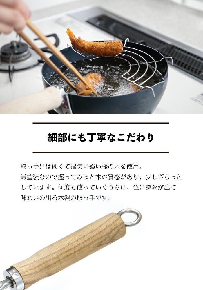 底面が小さいため、油を少なくしても揚げ物ができる優れたデザイン性を持ちます。700度以上の高温で施された熱処理により、錆びにくく、耐久性に優れています。