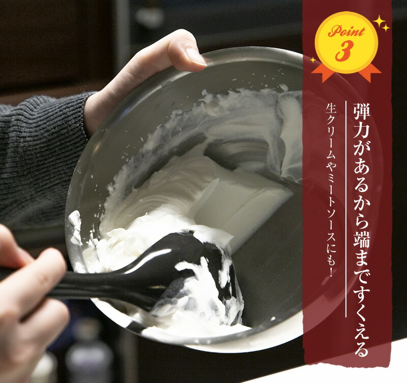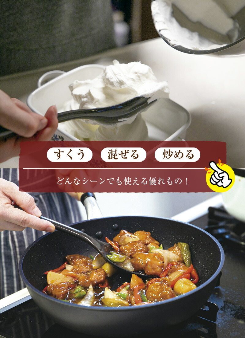 程よい弾力のシリコンなので、残った料理やソースも残さずきれいにすくい取れます。後片付けやフライパン内の料理、生クリームやチョコレートなどに便利です。