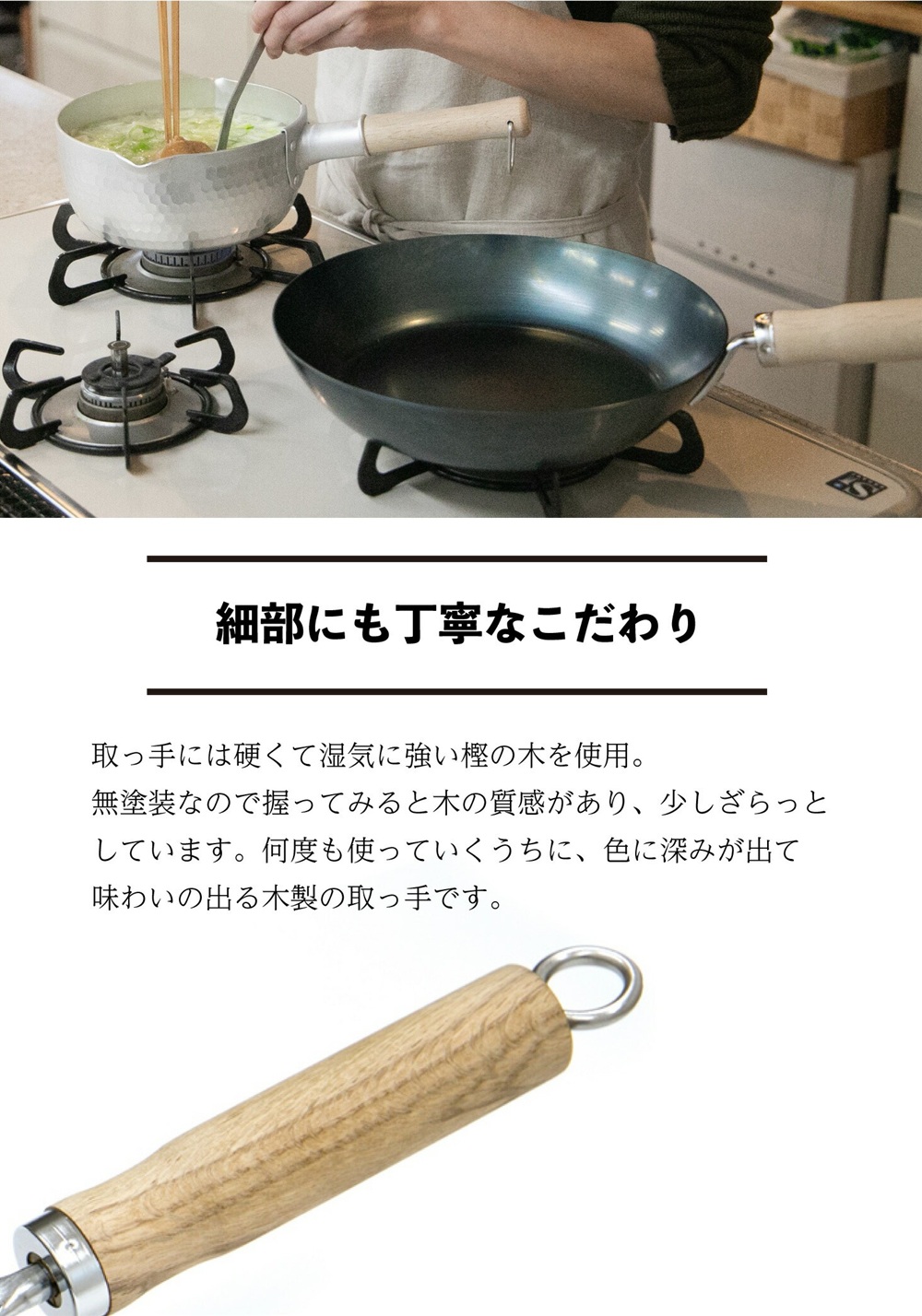 700度以上の直火による高度熱処理を施し、錆びにくく長寿命へ。さらに油ならしを工場で完了しているため、初めての使用時からスムーズに調理が始められます。側面を最大限薄く削るスピニング加工により、大幅な軽量化を実現。木刀にも使われる「樫の木」の取っ手は無塗装で、木の温かみある質感を楽しめます。