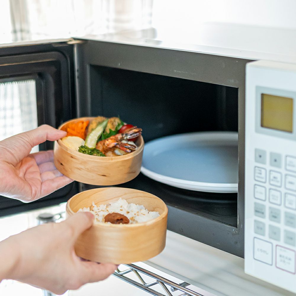 電子レンジ対応なので、温めOK。木の香りに包まれたおいしいごはんと、かわいいカラーのお弁当箱で気分がぱっと上がります。