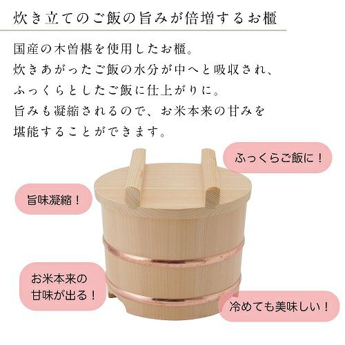 山一のニ人びつは、ごはんをおいしく保存するのに適したお櫃です。良質な木材として有名な木曽五木の中でも、軽くて通気性のよい木曽さわらを使ったコンパクトなお櫃は、2合のごはんを入れるのにぴったりなサイズ。小ぶりなお櫃なので、食卓でも冷蔵庫でも場所を取る心配はありません。木曽さわらの希少な柾目材からできたお櫃は、耐水性・耐酸性が高く、ふつうのごはんはもちろん、酢飯を保管するのにもお使いいただけます。調湿性に優れたお櫃で、炊き立てのごはんを移し替えると余分なごはんの水分を吸水し、おいしさをそのままキープ。乾燥したり、べたついたりせず、冷めたごはんでもうま味やもっちりした食感をお楽しみいただけます。木曽の木工職人が丁寧に仕上げたお櫃を使えば、炊き立てのごはんの香りと木曽さわらのほのかな木の香りが相まって、食欲が刺激されること請け合いです。木曽ひのきから作られたしゃもじ付きのセットなので、ご自宅用としてはもちろん、プレゼントにも最適。銅製の箍(たが)で固定されているため丈夫で長持ちしますが、使用後にしっかり乾燥させることで、長くご愛用いただけるでしょう。