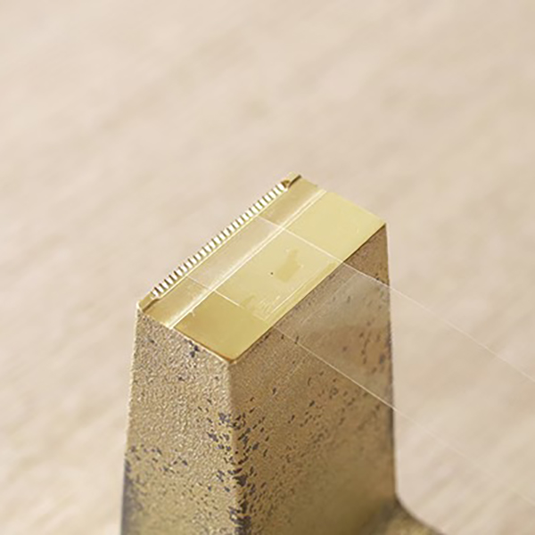最大の魅力は、鋳物ならではの「どっしりとした重み」。テープを引いても本体がズレにくく、片手でスッと快適に切ることができます。重さがありながらも、移動させやすいように下部に指が入る空間が設けられており、実用性への細やかな配慮が光ります。カッターの刃からテープを収めるローター部分にいたるまで、すべてが真鍮製。とくにカッター部分は、職人が一つひとつ手作業で削り出し、丁寧に刃付けを行っています。