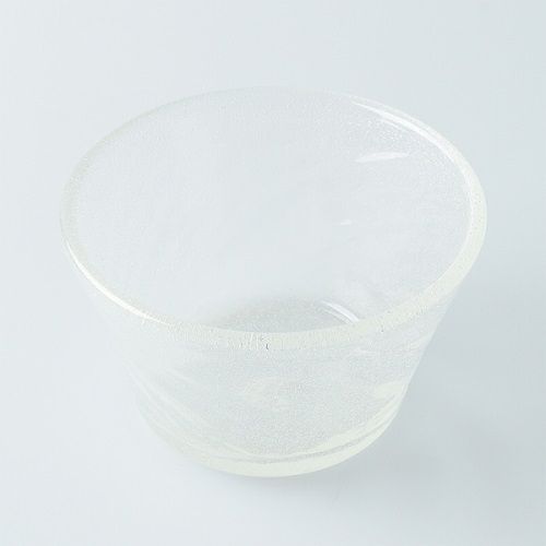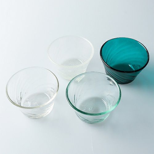 倉敷ガラスは、小谷栄次さんが作る吹きガラス製品。「生活の道具」としての使いやすさを大切にしたその製品には、シンプルでやさしい美しさが自然に宿ります。表面に入れられた、螺旋のような独特の網目模様(モール模様)や、「小谷ブルー」と称される独特の青色が特徴的です。付け合せや、おもてなしの一品を美しく引き立てる小鉢。そば猪口としても使えます。