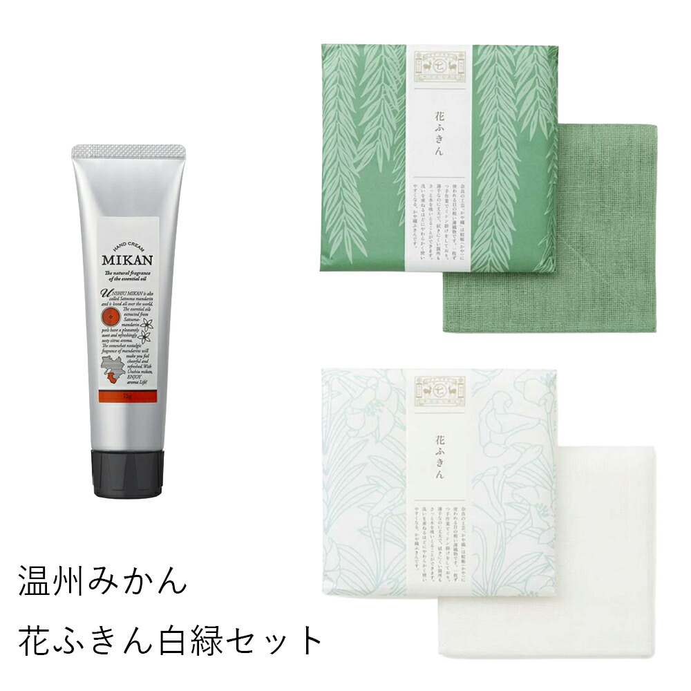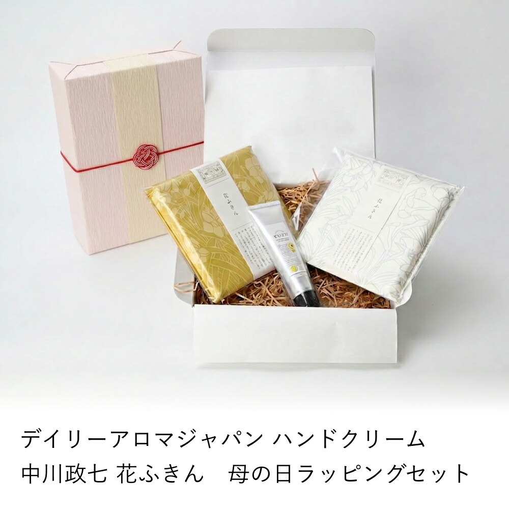 家事の合間にホッと一息つけるデイリーアロマジャパンの「国産柑橘のハンドクリーム」と、台所仕事をパッと明るくする中川政七商店の「花ふきん」2枚のセット。