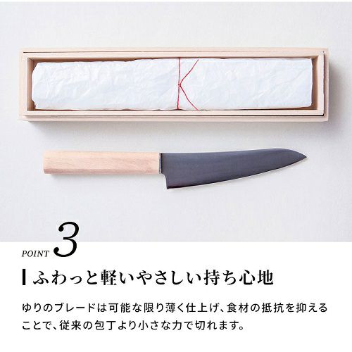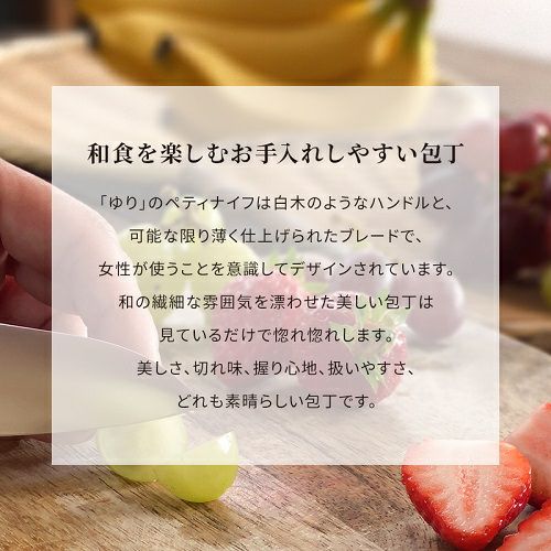 「ゆり」のペティナイフは白木のようなハンドルと、可能な限り薄く仕上げられたブレードで、女性が使うことを意識してデザインされています。