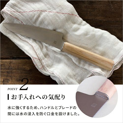 ステンレス製の包丁ですが、水気は禁物です。使い終わったらきちんと水分を拭き取って片づけましょう。特に、ハンドル部分の積層材は無塗装で、コーテングが施されていないので、使用後にきちんと水分をぬぐわないと黒ずみが発生することがあります。長く愛用するために、少しだけ気をつけましょう。