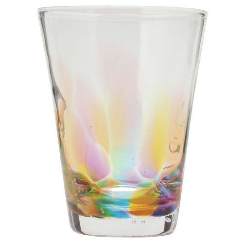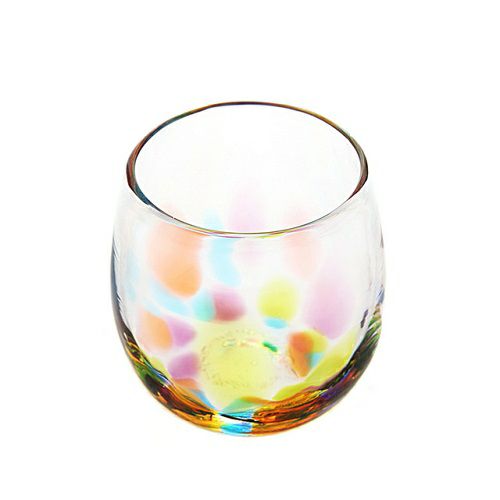 虹色しずく型グラスは、とっても可愛らしいグラスです。「赤・黄色・青・紫・水色」の5色のガラスで表現された虹。女性の手に収まるサイズ感と、コロンとしたフォルム。手作りによる温もりのある風合い。表面の凸凹は、虹の揺らめきをさらに表情豊かにしてくれています。底面にあえて入れられている気泡は、特に可愛らしいと評判。