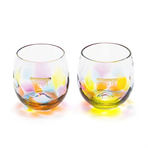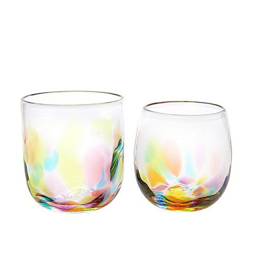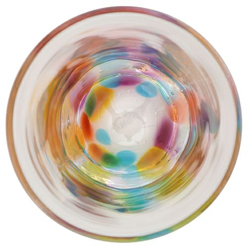 宙吹きの過程で5色の虹をまとって出来あがる虹色グラスは、職人さんがひとつひとつ手作りしています。型抜きではない、宙で作り上げられるなめらかな曲線と柔らかな表情。温もりを感じさせる手触り。虹色の配色も、表情豊かな表面の凸凹も一つとして同じものはありません。自分だけの虹色グラスです。ひとつひとつ違った虹を浮かべるグラスを選ぶ時間。美しい虹との出会いを楽しんでみてはいかがでしょうか。