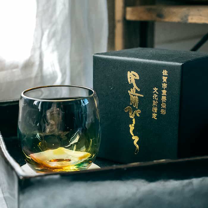 元々は職人さん自身の結婚式の引出物として作られた非売品。それが虹色シリーズのグラスです。大事な人への感謝を込めた贈り物は、当然のことながら大好評。引出物だけで終わらせておくのは惜しいということで、肥前びーどろのラインナップに追加されたといいます。ぜひ、大事な人へ可愛らしい虹を贈ってみてはいかがでしょうか。黒いシンプルな箱の佐賀市重要無形文化財指定の印字からは、肥前びーどろの歴史の深さが感じられ、格調高い贈り物として喜ばれるでしょう。