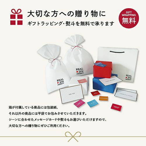 お誕生日やご結婚、出産のお祝いなどに、ギフトラッピングを無料で承ります。箱が付属している商品には包装紙、それ以外の商品には平袋でお包みさせていただきます。 シーンに合わせたメッセージカードや熨斗もお選びいただけますので、大切な方への贈り物にぜひご利用ください。